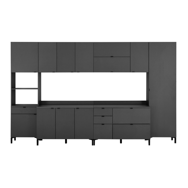 Assinada com exclusividade pela equipe T S Design, a cozinha Sleek combina design inteligente, medidas compactas e construção simplificada, criadas para oferecer praticidade e máximo aproveitamento em cozinhas, áreas gourmet e ambientes integrados com lavanderias, com um visual urbano. Este conjunto de cozinha é desenvolvido com caixaria em MDP de 15 mm e tampo em MDP de 25 mm, com frontão de 15 mm, revestidos com laminado melamínico de baixa pressão (BP) e bordas em PVC, que garantem um acabamento impecável e maior proteção contra impactos e umidade. Além disso, possui pés em polipropileno e puxadores em chapa de aço com acabamento em pintura; materiais e acabamentos que atestam sua resistência e durabilidade - atributos ideais para o dia a dia. Composto por: 1 paneleiro 2 portas/1 gaveta, 1 armário inferior 2 portas/3 gavetas c/tampo, 1 armário inferior de 3 portas c/tampo, 1 armário superior 2 portas basculantes, 1 armário superior de 3 portas e 1 armário de lavanderia c/1 porta.Observação: Produtos fornecidos desmontados.