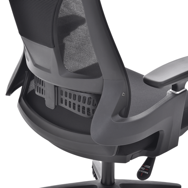 Cadeira giratória, com base em polipropileno, assento com espuma de poliuretano (D40) e tecido 100% poliéster. Possui apoio para os braços 3D, encosto em tela sintética, função relax no assento/encosto e regulagem de altura a gás com pistão classe 2.