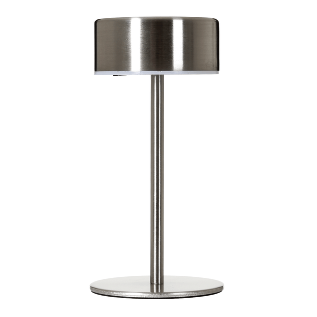 Luminária led recarregável, 127/220V, em metal com acabamento escovado. Possui led embutido, 3 temperaturas de cor (quente, branca e neutra) e acionamento por interruptor.