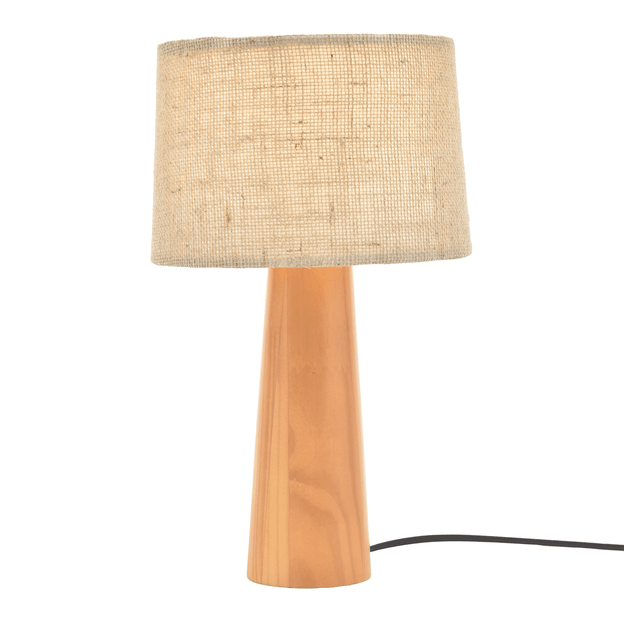 Base de luminária de mesa, 127/220V, em madeira maciça de reflorestamento (Pinus Elliottii) tingida com aplicação de verniz.Cúpula com estrutura em aramado de aço com acabamento em pintura epóxi-pó revestida com acetato e juta natural.