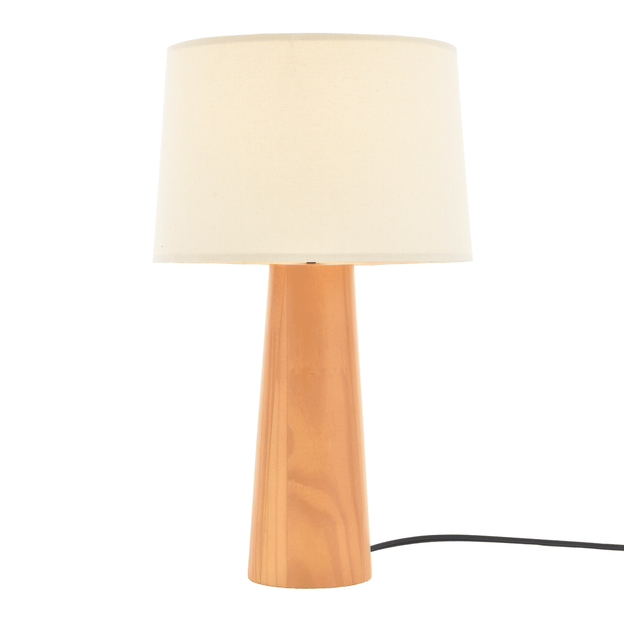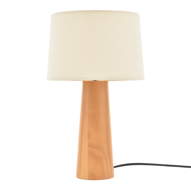 Base de luminária de mesa, 127/220V, em madeira maciça de reflorestamento (Pinus Elliottii) tingida com aplicação de verniz.Cúpula com estrutura em aramado de aço com acabamento em pintura epóxi-pó revestida com tecido 100% algodão.