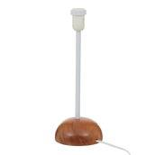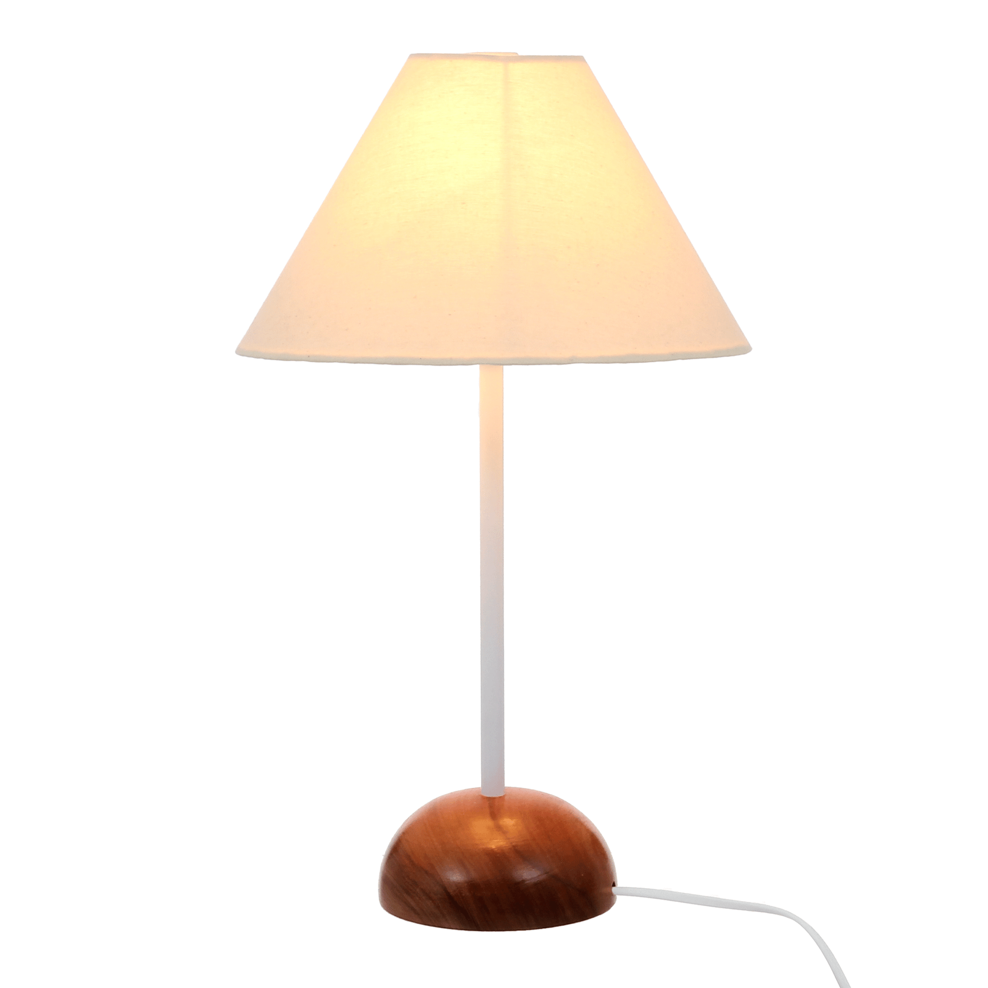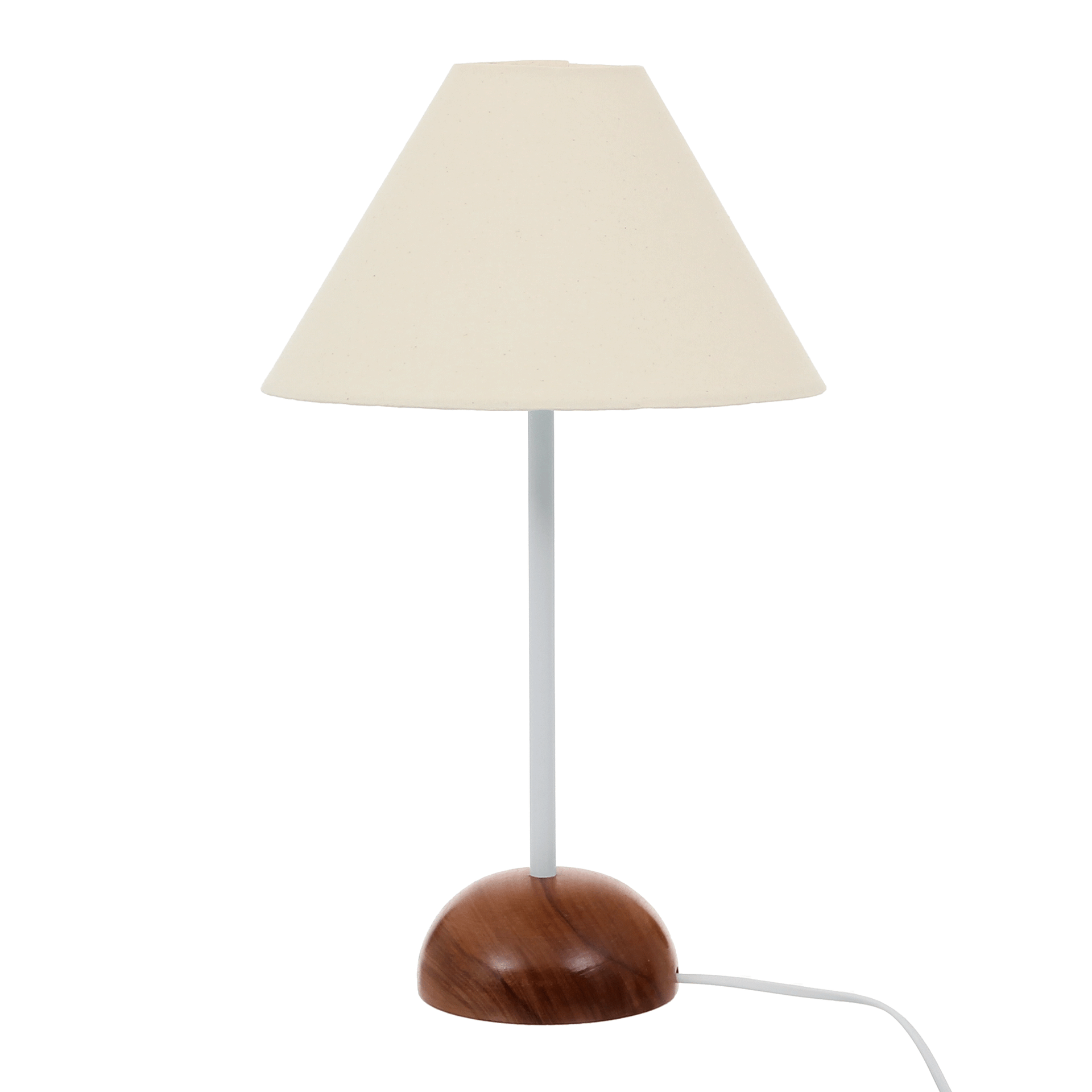 Base de luminária de mesa, 127/220V, em madeira maciça (Jequitibá) torneada com acabamento em verniz e haste em tubo de aço com pintura epóxi-pó.Cúpula com estrutura em aramado de aço com acabamento em pintura epóxi-pó revestida com acetato e tecido 100% algodão.