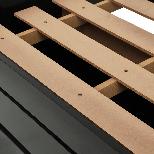 Cama de solteiro, em MDF (Medium Density Fiberboard) com acabamento em pintura por impressão e bordas em PVC. Possui 4 gavetas com corrediças metálicas, 2 nichos e sapatas plásticas.