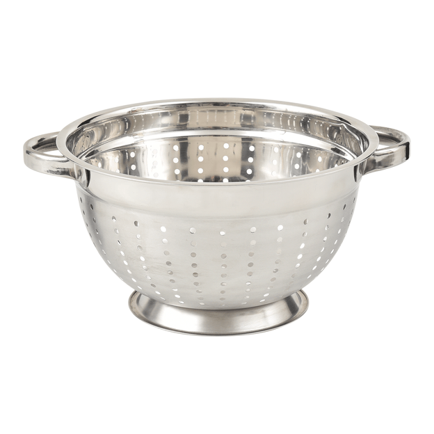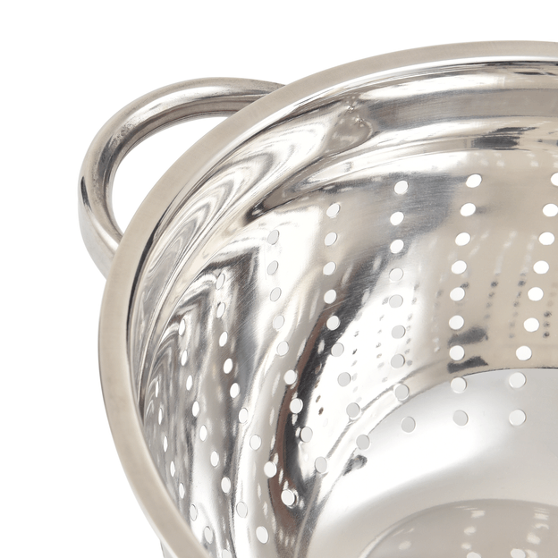 Escorredor de macarrão, em aço inoxidável. Possui alças laterais para manuseio.
