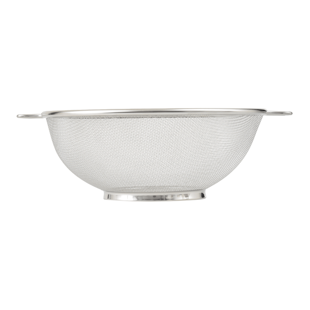 Escorredor multiuso, em aço inoxidável. Possui alças laterais para manuseio.