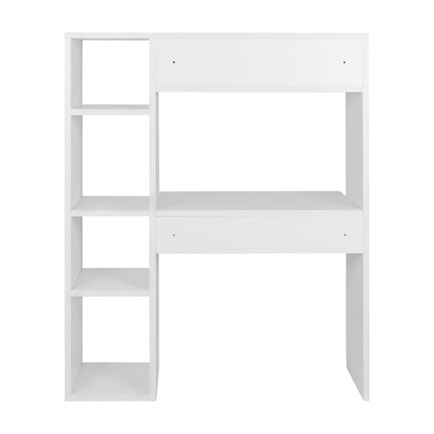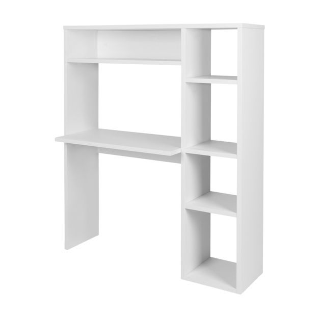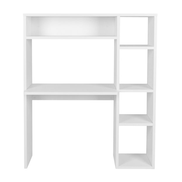 Escrivaninha em MDP (Medium Density Particicleboard) de 25 mm com acabamento em pintura por impressão e bordas em PVC. Possui 1 tampo, 5 nichos, sendo 1 fechado, e sapatas plásticas.