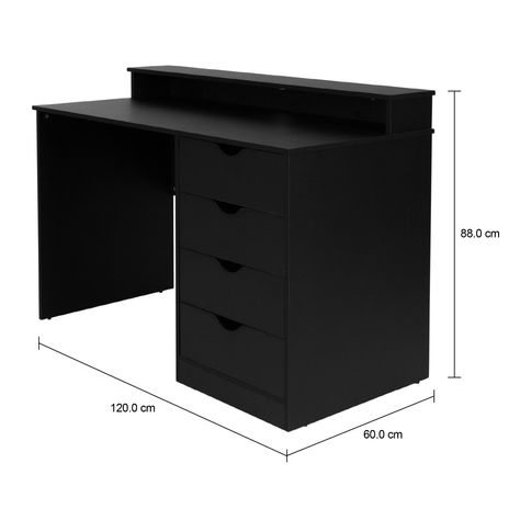 Escrivaninha em MDP (Medium Density Particleboard) de 15 mm revestido com laminado melamínico de baixa pressão e acabamento de bordas em PVC. Possui 4 gavetas com corrediças metálicas, 1 prateleira superior, passa-fios e sapatas plásticas.