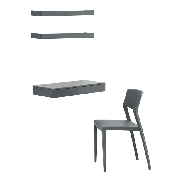 Cadeira, empilhável, em polipropileno e fibra de vidro com proteção contra radiação ultravioleta.Prateleira para parede, em MDF (Medium Density Fiberboard) de 15 mm com acabamento em pintura poliuretânica.Prateleira para parede, em MDF (Medium Density Fiberboard) de 15 mm com acabamento em pintura poliuretânica. Possui 1 gaveta.