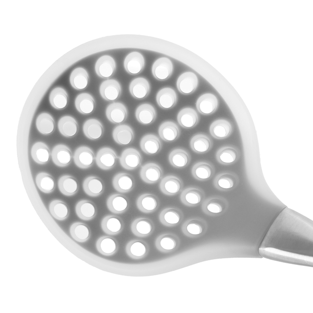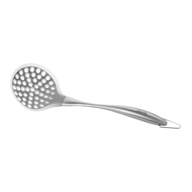 Escumadeira, em silicone com cabo em aço inoxidável. Possui alça para que possa ser pendurada.