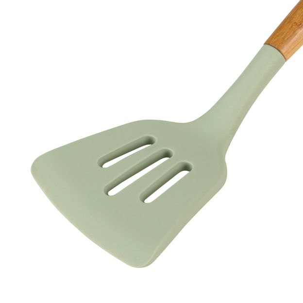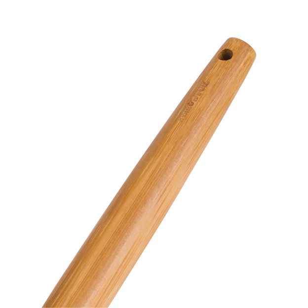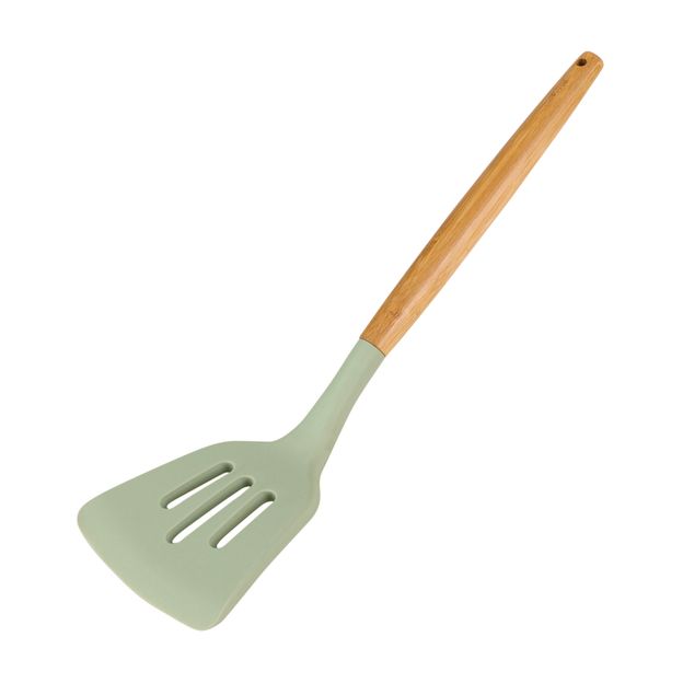 Espátula vazada em silicone, com cabo em bambu. Possui orifício para que possa ser pendurada.