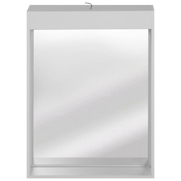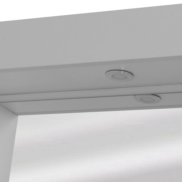 Espelho com moldura em MDP (Medium Density Particleboard) revestido com laminado melamínico de baixa pressão e bordas em PVC. Acompanha lâmpada com iluminação por LED, luz branca, com potência de 1, 5 Watts, 127/220 Volts, com vida útil de até 30.000h.