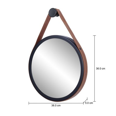 Espelho com moldura em alumínio com acabamento em pintura epóxi-pó. Possui alça em revestimento sintético PVC com detalhes em pespontos.