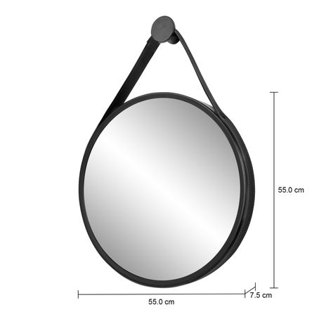 Espelho com moldura em alumínio com acabamento em pintura epóxi-pó. Possui alça em revestimento sintético PVC com detalhes em pespontos.