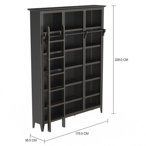 Estante em madeira maciça de reflorestamento (Pinus Elliottii) e MDF (Medium Density Fiberboard) tingidos com acabamento em verniz poliuretano e desgaste nas bordas. Possui 18 nichos, sendo 12 prateleiras reguláveis. Acompanha escada.