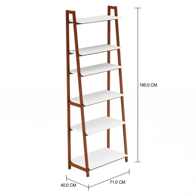 Estante com estrutura em madeira maciça (Eucalipto) com acabamento em verniz. Possui 6 prateleiras em MDF (Medium Density Fiberboard) com acabamento em pintura.