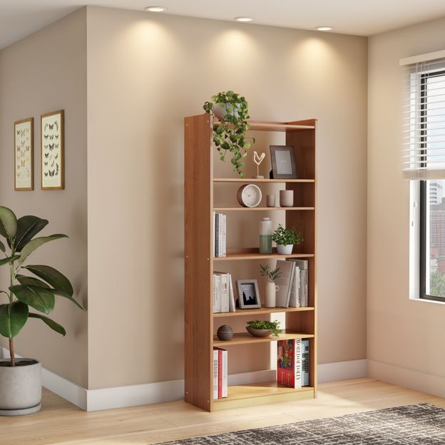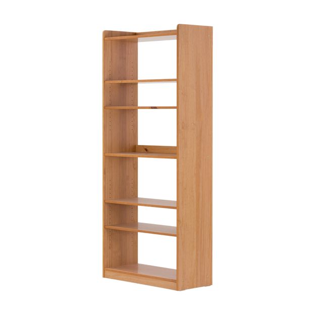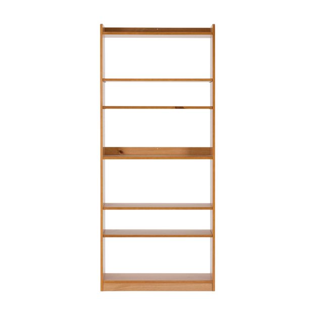 Estante em madeira maciça de reflorestamento (Pinus Elliottii) tingida com aplicação de verniz poliuretano. Possui 6 nichos, sendo 4 prateleiras reguláveis e sapatas plásticas.