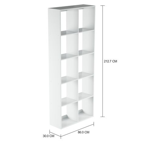 Estante em MDP (Medium Density Particleboard) com acabamento em pintura por impressão. Possui 10 nichos e sapatas plásticas. Permite o uso vertical e horizontal, apoiada ao solo.