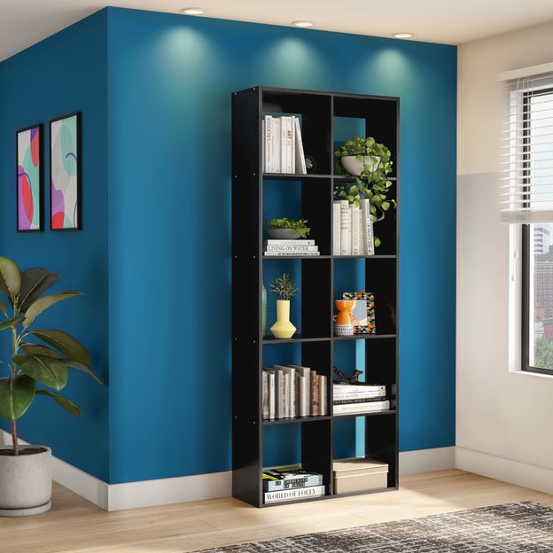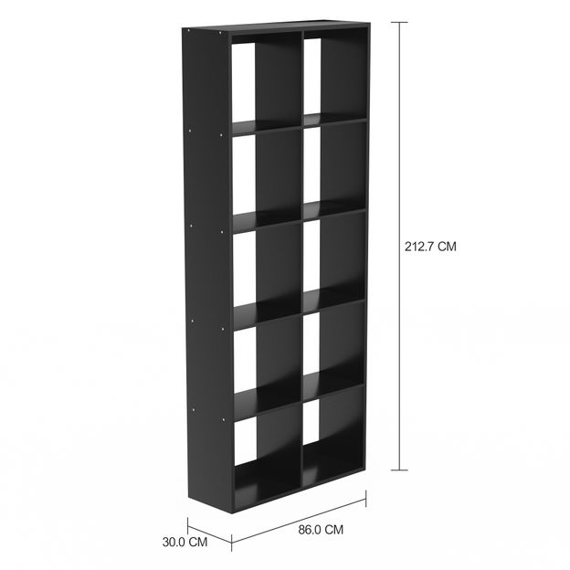 Estante em MDP (Medium Density Particleboard) com acabamento em pintura por impressão. Possui 10 nichos e sapatas plásticas. Permite o uso vertical e horizontal, apoiada ao solo.