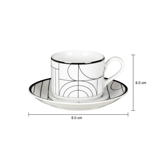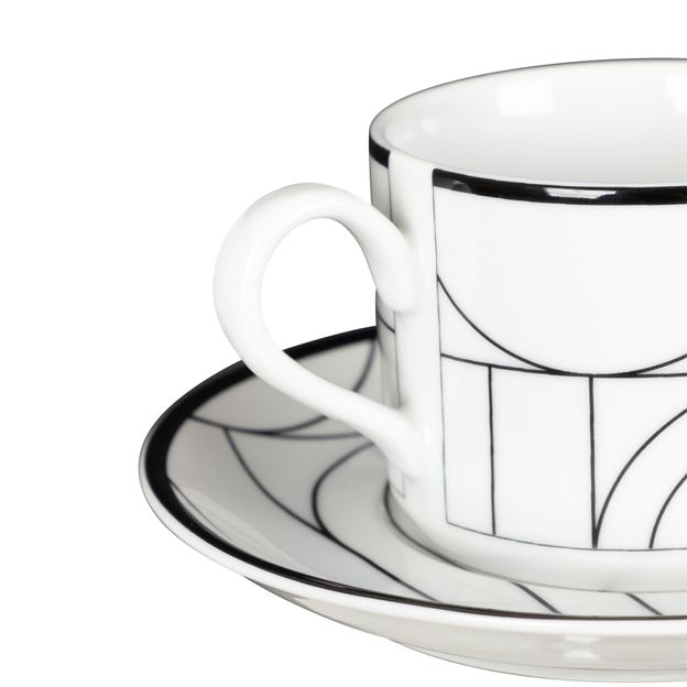 Xícara para chá, com pires, em porcelana com aplicação de estampa em decalque.
