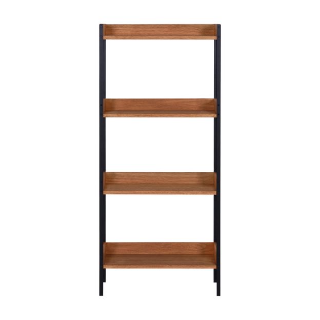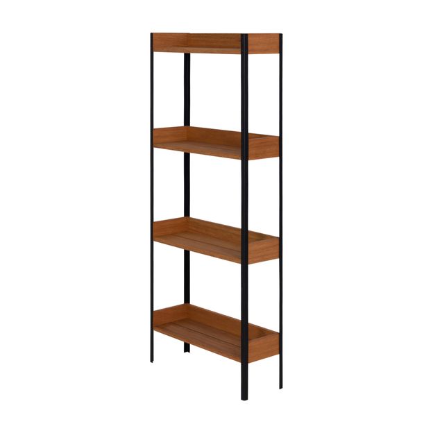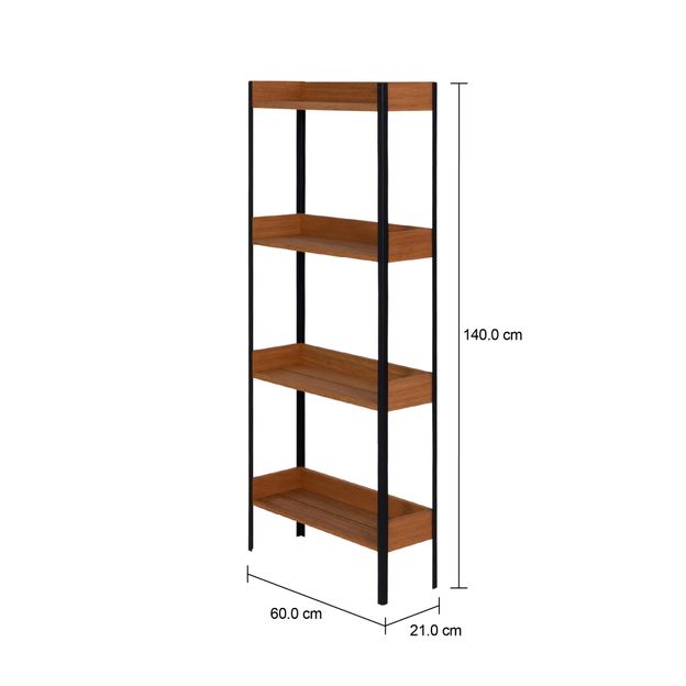 Floreira/estante, com estrutura em aço galvanizado com acabamento em pintura epóxi-pó. Possui 4 prateiras em madeira maciça de reflorestamento (Eucalipto) de 20 mm com tingidor impermeabilizante, tipo stain, com ação inseticida e fungicida.