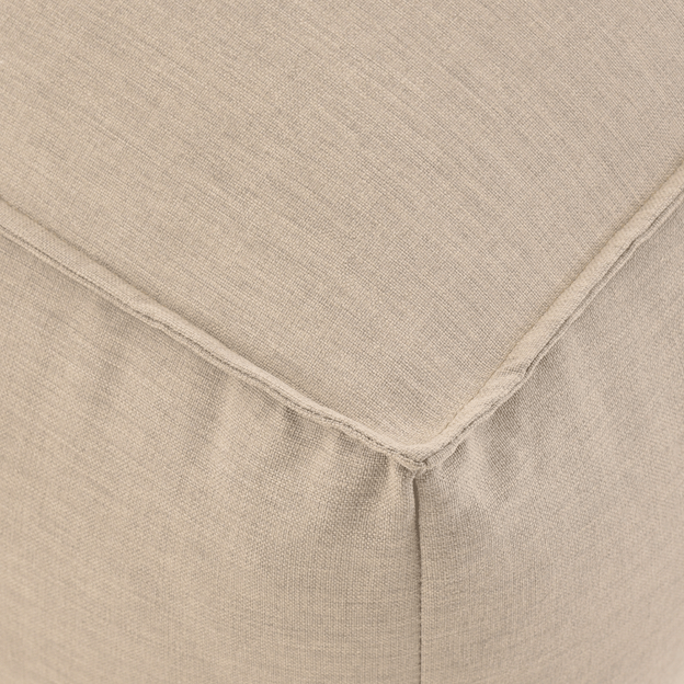 Puff com enchimento em esferas de EPS (Isopor) de alta densidade com retardante a chamas, forro interno em poliamida impermeável e revestimento em tecido tramado 100% polipropileno com tratamento hidrorrepelente e proteção UV.