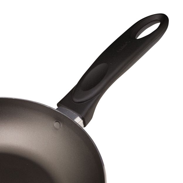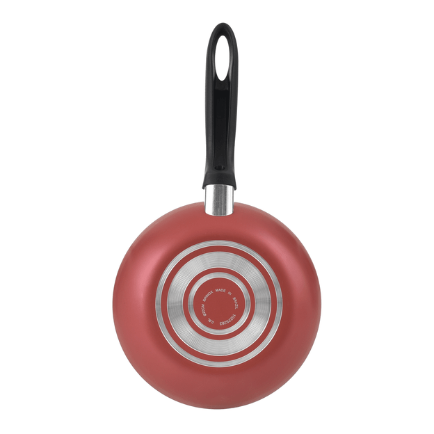 Frigideira em alumínio 1.8 com revestimento antiaderente Pro-Flon e cabo anatômico em baquelite com orifício para que possa ser pendurada.