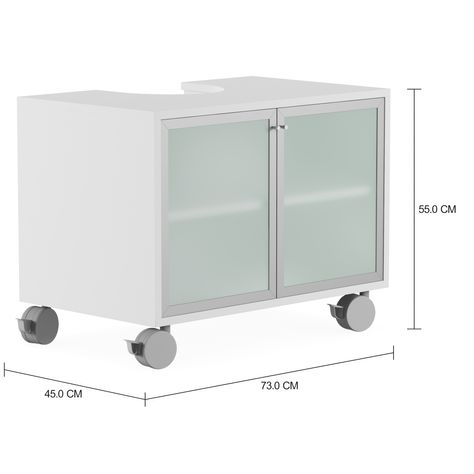 Gabinete em MDP (Medium Density Particleboard) revestido com laminado melamínico de baixa pressão e bordas em PVC. Possui 2 portas em vidro miniboreal com moldura em alumínio, 1 prateleira regulável e rodízios em nylon, sendo os frontais com trava.
