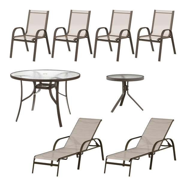 Cadeira com braços, com estrutura em tubo de alumínio com acabamento em pintura eletrostática à base de poliéster e assento/encosto em tela sintética com proteção contra radiação ultravioleta. Possui sapatas plásticas.Chaise longue com estrutura em tubo de alumínio com acabamento em pintura eletrostática à base de poliéster e assento/encosto em tela sintética com proteção contra radiação ultravioleta. Possui regulagem em 5 posições para o encosto.Mesa com estrutura em tubo de alumínio com acabamento em pintura eletrostática com proteção contra radiação ultravioleta e tampo em vidro incolor temperado com acabamento 'craquelado'. Possui sapatas plásticas.Mesa lateral, com estrutura em tubo de alumínio com acabamento em pintura eletrostática com proteção contra radiação ultravioleta e tampo em vidro incolor temperado com acabamento 'craquelado'. Possui sapatas plásticas.