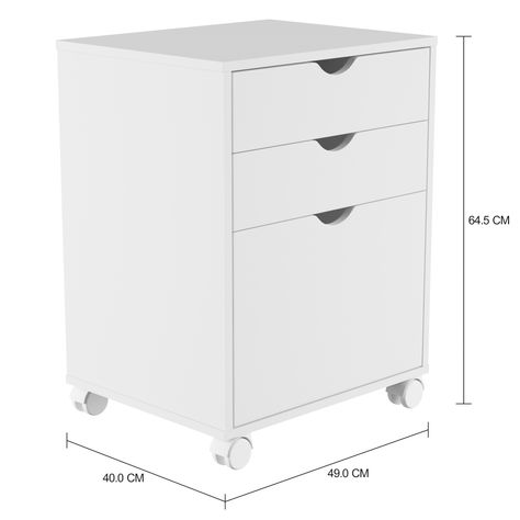 Gaveteiro em MDP de 15 mm revestido com laminado melamínico baixa pressão com bordas em PVC. Possui 3 gavetas, sendo 1 para pastas suspensas, com corrediças metálicas, e rodízios plásticos.