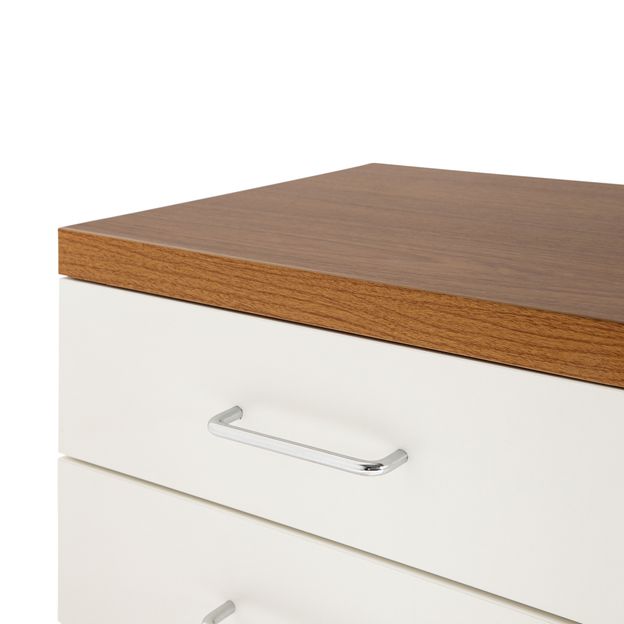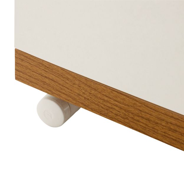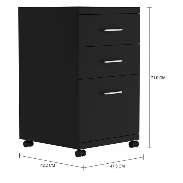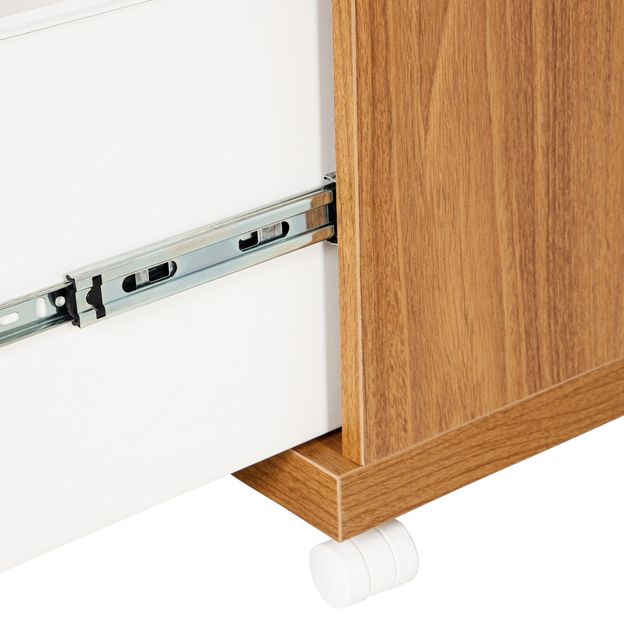 Gaveteiro em MDP (Medium Density Particleboard) revestido com laminado melamínico de baixa pressão e bordas em PVC. Possui 3 gavetas com corrediças metálicas, sendo 1 para pastas suspensas com corrediças telescópicas, e rodízios plásticos.