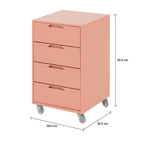 Gaveteiro em chapa de aço com acabamento em pintura epóxi-pó. Possui 4 gavetas e rodízios em nylon sem travas.