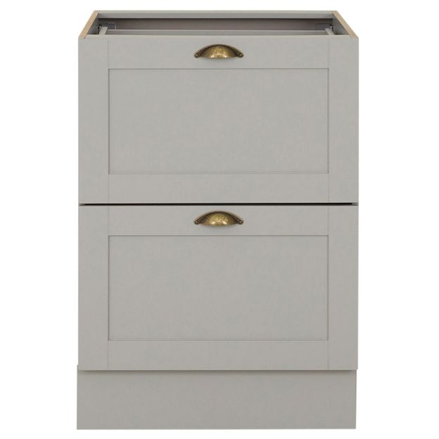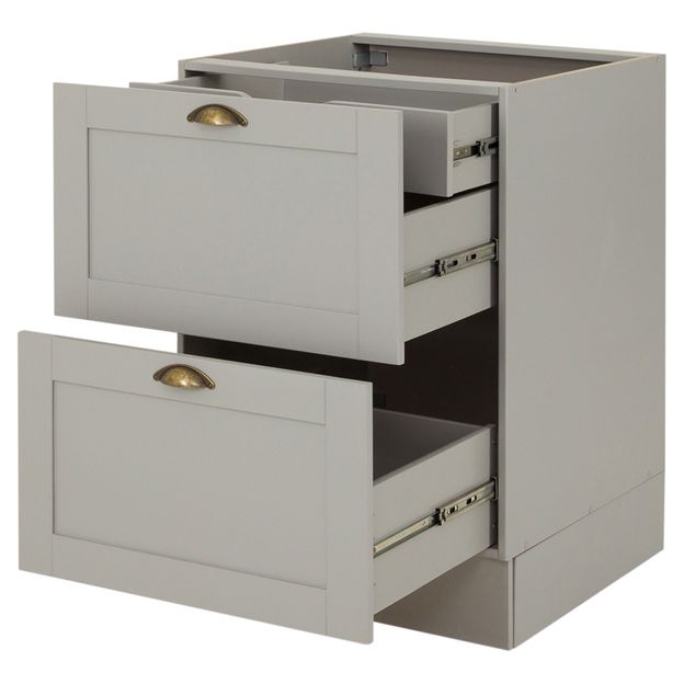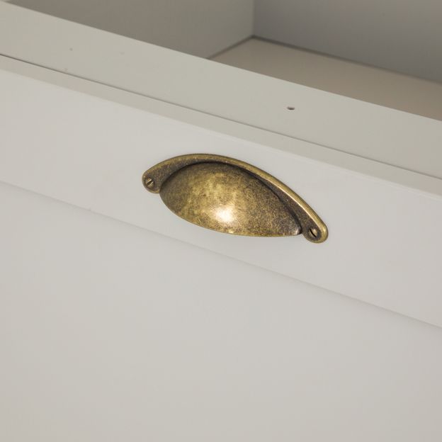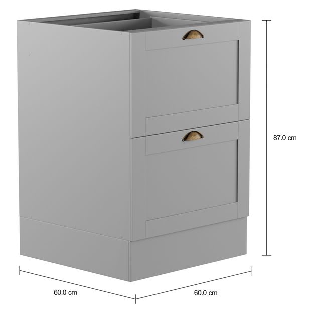 Gaveteiro em MDF com acabamento em pintura poliuretânica. Possui 3 gavetas, sendo 1 rasa, com corrediças telescópicas, pés plásticos reguláveis e rodapés removíveis. Acompanha puxador em zamac envelhecido.