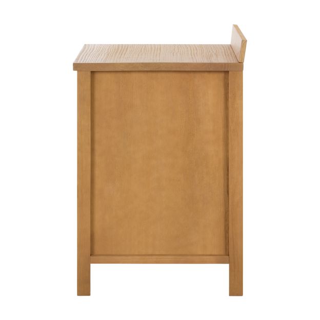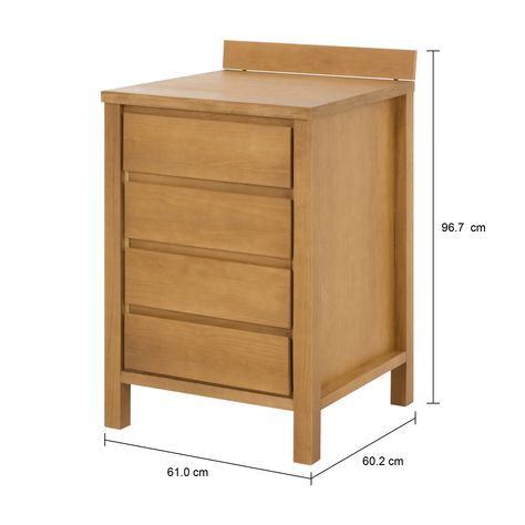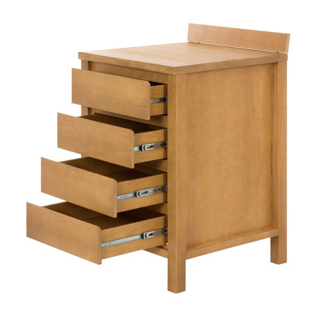 Gaveteiro em madeira maciça de reflorestamento (Pinus Elliottii) tingida e escovada com aplicação de verniz. Possui 4 gavetas com corrediças telescópicas.