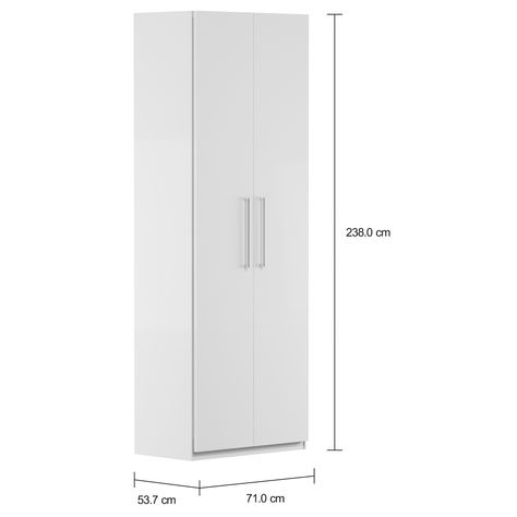 Guarda-roupa modular, em MDP (Medium Density Particleboard) de 15 mm com acabamento em pintura por impressão, com bordas em PVC. Possui 2 portas, 3 nichos, 3 gavetas com corrediças telescópicas, rodapés em MDF e sapatas plásticas.