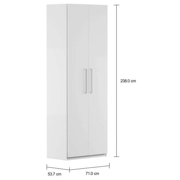 Guarda-roupa modular, em MDP (Medium Density Particleboard) de 15 mm com acabamento em pintura por impressão, com bordas em PVC. Possui 2 portas, 3 nichos, 3 gavetas com corrediças telescópicas, rodapés em MDF e sapatas plásticas.