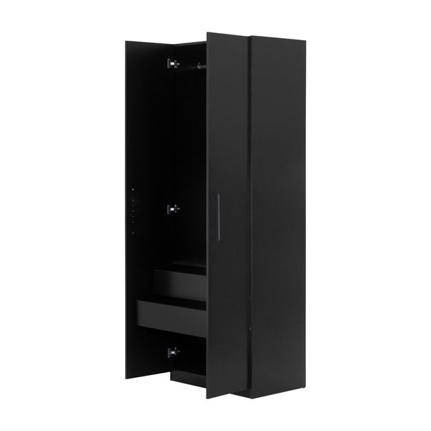 Guarda-roupa em MDP de 15 mm com acabamento em pintura por impressão UV, com bordas em PVC. Possui 2 portas, 2 gavetas com corrediças metálicas, 2 nichos, 1 cabideiro em tubo de alumínio e sapatas plásticas.