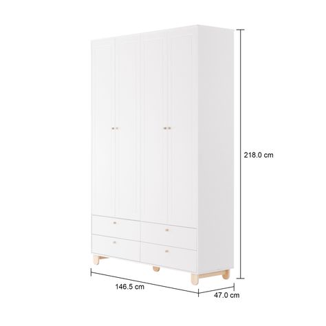 Guarda-roupa em MDF (Medium Density Fiberboard) de 15 mm com acabamento em pintura. Possui 4 portas, 4 gavetas com corrediças telescópicas, 7 nichos, 1 cabideiro em alumínio, puxadores e pés em madeira maciça (Pinus Elliottii) tingida.