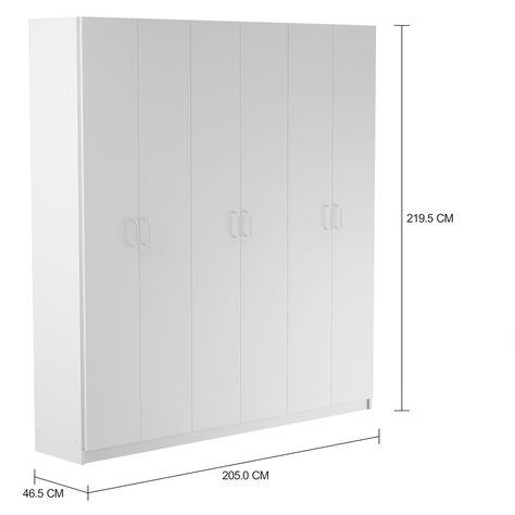 Guarda-roupa em MDP (Medium Density Particleboard) com acabamento em pintura por impressão. Possui 10 nichos, 6 portas, 3 gavetas com corrediças metálicas, 3 cabideiros em tubo de alumínio e sapatas plásticas.