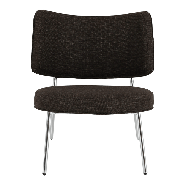 Poltrona com estrutura em tubo de aço com acabamento cromado, encosto em chapa de aço curvada e assento em compensado revestidos com espuma de poliuretano e tecido tramado. Possui sapatas plásticas.