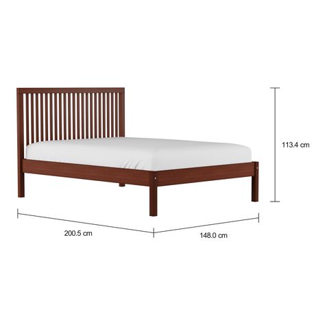 Cama de casal com pés e cabeceira em madeira maciça de reflorestamento (Eucalipto) e barras em MDF revestido com lâmina natural (Jequitibá) tingida. Possui estrado em madeira maciça (Pinus Elliottii) e travessa central em aço pintado em epóxi-pó.