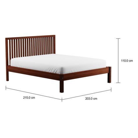 Cama king com pés e cabeceira em madeira maciça de reflorestamento (Eucalipto) e barras em MDF revestido com lâmina natural (Jequitibá) tingida. Possui estrado em madeira maciça (Pinus Elliottii) e travessa central em aço pintado em epóxi-pó.