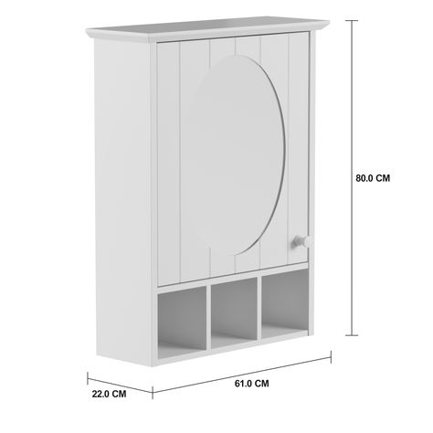 Armário em MDF (Medium Density Fiberboard) com acabamento em pintura e bordas desgastadas. Possui 1 porta com espelho e 6 nichos, sendo 2 prateleiras móveis. Acompanha puxador.