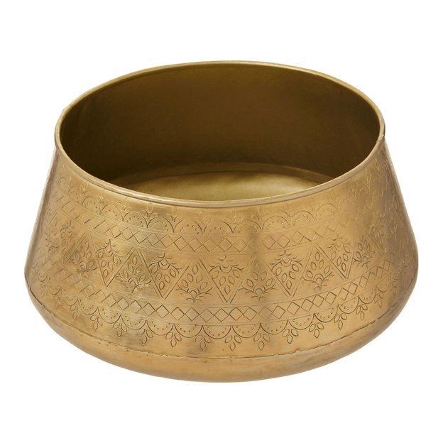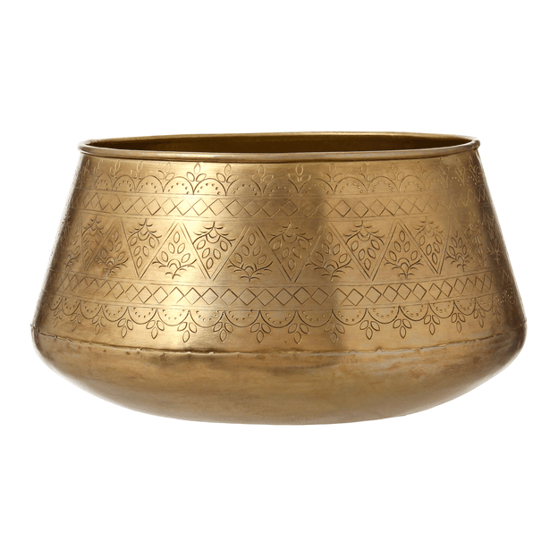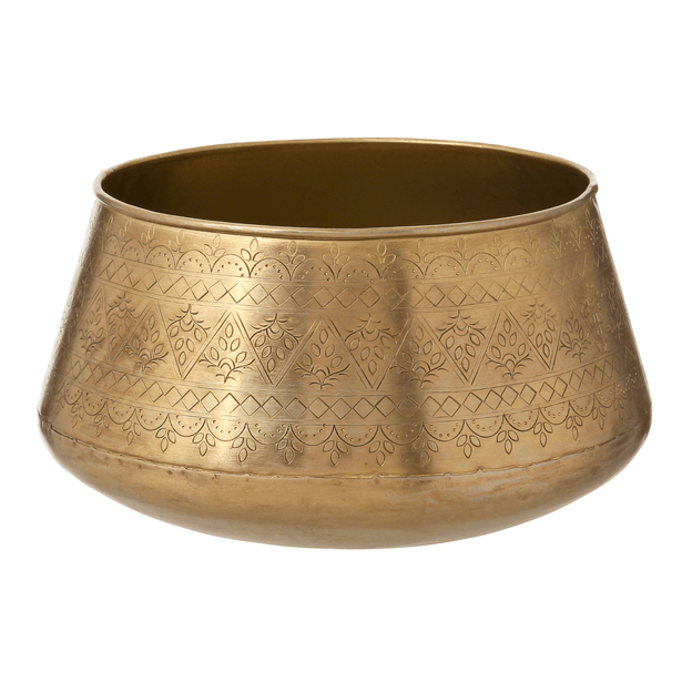 Cachepô, em ferro com acabamento metalizado e detalhes em relevo.