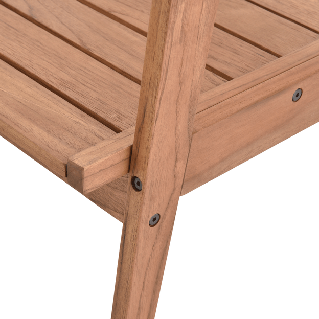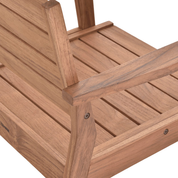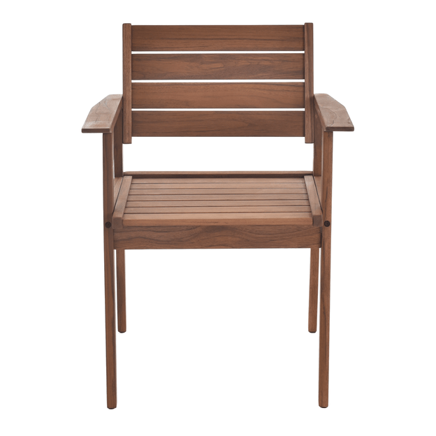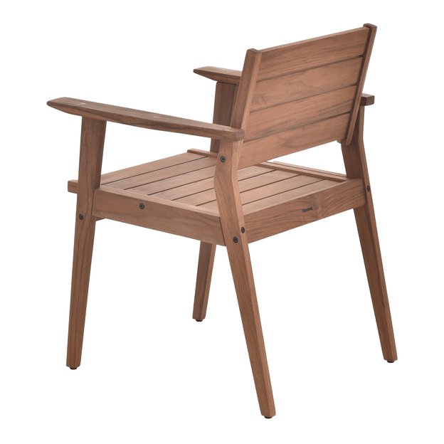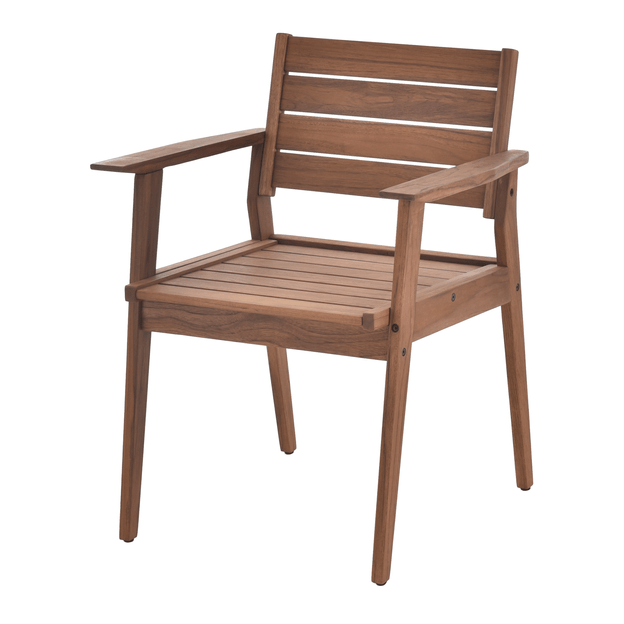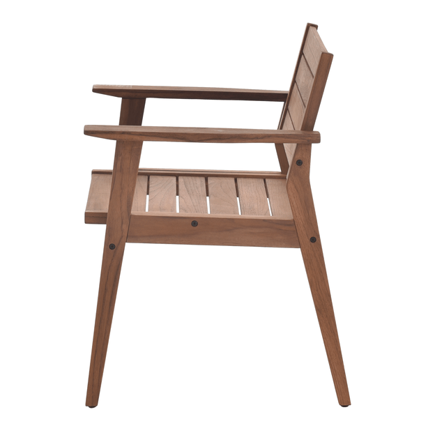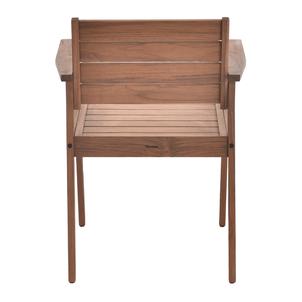 Cadeira com braços, em madeira maciça (Teca) com acabamento tingidor impermeabilizante, tipo stain, à base de água com ação inseticida e fungicida. Possui sapatas plásticas.