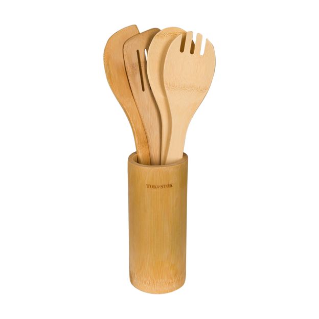 Kit de utensílios composto por: 1 colher, 1 colher vazada, 1 espátula e 1 espátula vazada em bambu. Acompanha suporte.