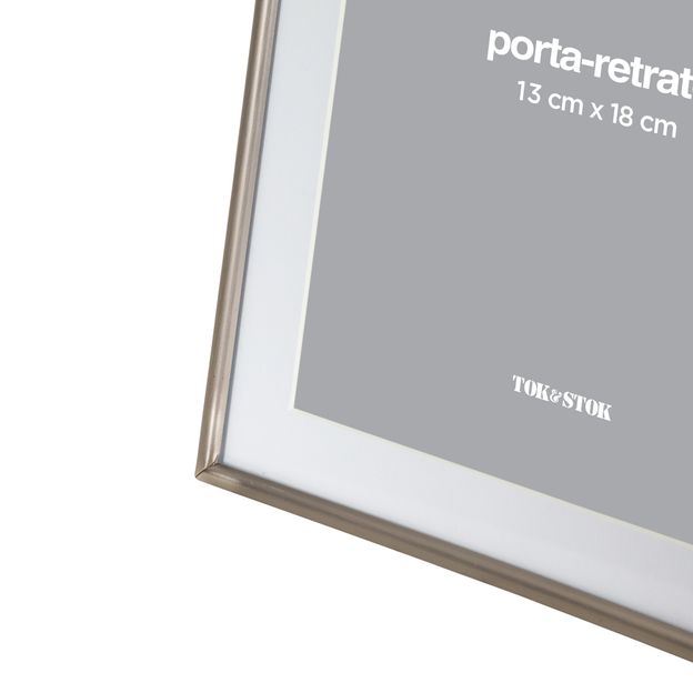 Porta-retrato, para mesa, em metal com acabamento em pintura e visor em vidro incolor e passe-partout removível. Pode ser usado na horizontal ou vertical e comporta fotos de até 13 cm x 18 cm.