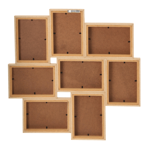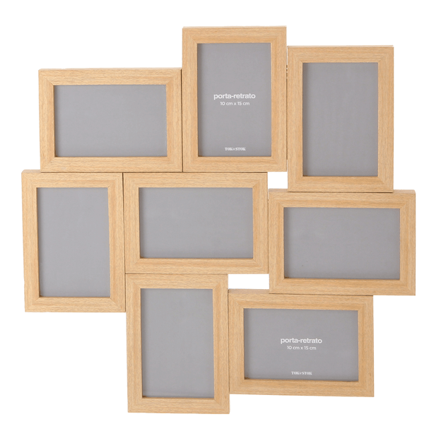 Porta-retrato múltiplo, para parede, com moldura em MDF (Medium Density Fiberboard) revestida por finish foil e vidro incolor. Para uso com até 8 fotos, horizontais e verticais, 10 x 15 cm. Não acompanha componentes para fixação.