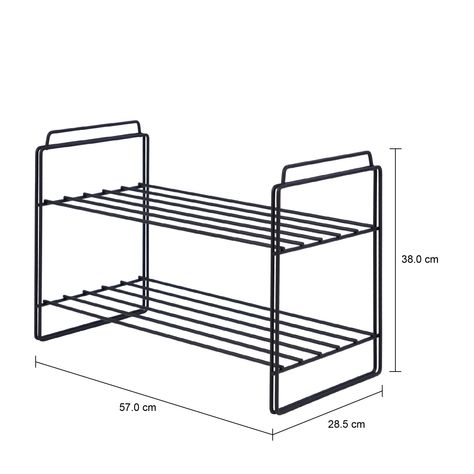 Sapateira, empilhável, em aramado de aço com acabamento em pintura epóxi-pó. Possui 2 prateleiras.