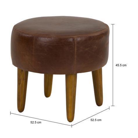 Puff em couro encerado com estrutura em madeira maciça de reflorestamento (Eucalipto), e assento em compensado multilaminado revestido com espuma (D26). Possui pés maciços tingidos.