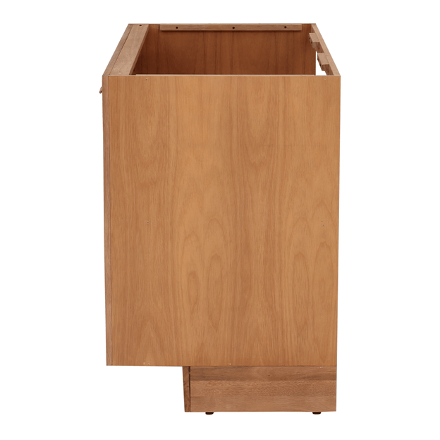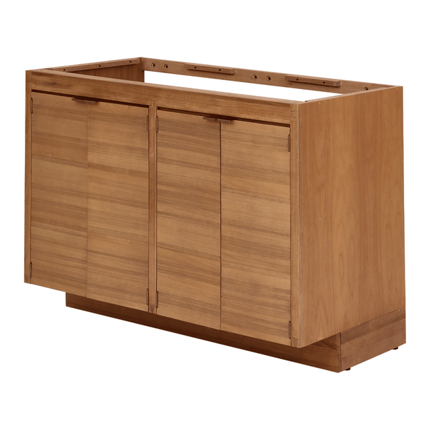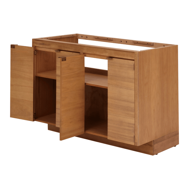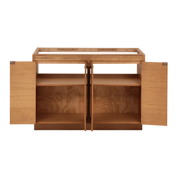 Armário inferior em madeira maciça (Tauari) e MDF laminado (Tauari), tingidos com aplicação de selador e acabamento encerado. Possui 4 portas com puxadores em aço pintado, 2 nichos, vão livre para instalação hidráulica e sapatas plásticas reguláveis.